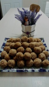 A kekszből és a fűszerből egy keveset félreteszünk, ebben fogjuk megforgatni a golyókat. A többi hozzávalót összegyúrjuk, majd meghempergetjük a fűszeres darált kekszben.