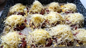 Egy tepsit sütőpapírral kibélelünk (lehet lisztezni, vajazni is, de én a könnyen tisztítás miatt mindent sütőpapírral bélelek ki). A darált húst fűszerezem, 12 darabot kicsípek belőle. Gombócot formázok, kissé lelapítom a kezemmel. Beleteszem a tepsibe. A hagymát, tojást, krumplit ráreszelem a húsra. Sajttal befedem. 180 fokon kb. 35-40 percig sütöm.