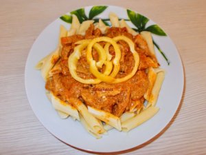 A húst és a szalonnát csíkokra, a gombát szeletekre(mivel üveges gombám volt, ezzel nem foglalkoztam), a hagymát apróra vágjuk. A paprikát és a paradicsomot is felkockázzuk. A kipirított szalonnán megfonnyasztjuk a hagymát, rátesszük a paprikát és a paradicsomot, és pár percig pároljuk. Hozzáadjuk a húst, a gombát, sózzuk, borsozzuk, megszórjuk a pirospaprikával, és kevés vizet öntve alá puhára pároljuk. A liszttel elkevert tejföllel behabarjuk és összeforraljuk. Nekem rizs illik igazán mellé, de férjecske tésztát óhajtott 🙂