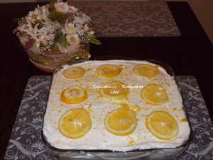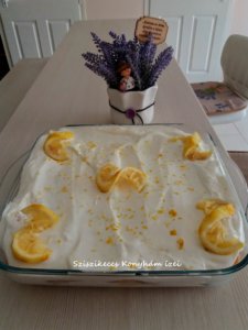 A tejfölt habosra keverjük a kétféle cukorral, belekeverjük a citromok reszelt héját és levét. A tejszínt kemény habbá verjük, majd óvatosan beleforgatjuk a citromos krémbe. Egy jénai tál alját kirakunk babapiskótával, rákenjük a fele krémet, majd ismét egy sor piskóta jön, és a tetejére simítjuk a maradék citromos krémet. Citromgerezdekkel és levélkével díszítjük. Egy éjszakára hűtőbe tesszük.