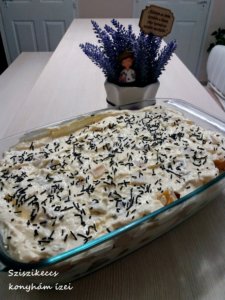 A túrót villával összetöröm, hozzáadom a tojásokat és a cukrokat. A habtejszínt botmixerrel épphogy habosra verem. Ráöntöm a túróra, és a mixerrel simára keverem. Egy tálba rétegzem: túrókrém, piskóta, gyümölcs. túrókrém, piskóta, gyümölcs…. Túróval zárom, 3-4 órára hűtőbe teszem.