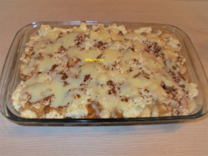 A megsült kifli tetejére fahéjat szórok, kicsi öntet is mehet rá . Tálaláskor adom hozzá a többi öntetet.