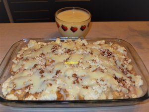 Közben elkészítem az öntetet. A vaníliapudingot a csomagoláson leírtak szerint elkészítem, annyi, hogy több tejben főzzük, hogy öntet állagú legyen.