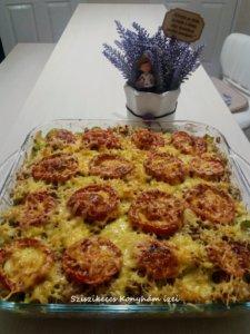 A cukkinit átmosom, majd egy jánai aljára teszem. Ráöntöm az elkészült húst, összekeverem az egészet. Paradicsomkarikákkal kirakom a tetejét, majd jól megszórom reszelt sajttal. 180 fokon. kb 45 percig sütöm.