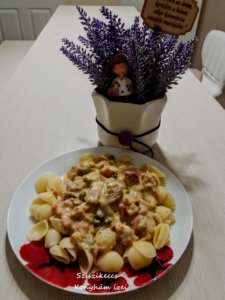 A csirkemellet olajon megpirítom,fűszerezem, ráöntök egy pohár vizet. Hozzáadom a zöldségeket és tovább párolom. Amikor megpuhultak a zöldségek, belekeverem a tömlős sajtokat. Készre főzöm.