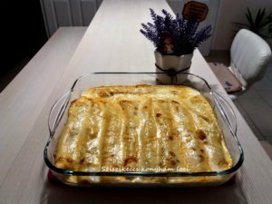 a palacsinta alapanyagait csomómentesre keverjük, kisütjük. A hagymát apróra vágjuk és kevés olajon megdinszteljük, majd hozzáadjuk a felkockázott húst és fűszerezzük. Mikor a hús megpirult, belekeverjük a tejfölt és a reszelt sajtot is. A palacsintákat egyenként megtöltjük raguval, majd egy kiolajozott hőálló edénybe tesszük őket szorosan egymás mellé. A főzőtejszínt, a tejfölt és a reszelt sajtot összekeverjük, fűszerezzük és a palacsintákra öntjük. 180 fokos sütőben 15-20 perc alatt készre sütjük.