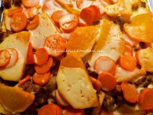 Egy tűzálló tálba rétegezzük az édesburgonyát, rá a húst, majd fedjük be répával elkevert burgonyával. Tetejére ráöntjük a mártást. 200 fokon kb. 40 perc alatt készre sütjük.