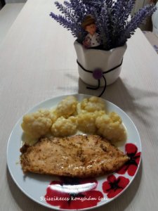 A karfiolt rózsáira szedem, megfőzöm. Az őzgerinc formát kissé kivajazom, megszórom zsemlemorzsával, majd beleteszem a bacont úgy, hogy lógjon túl rajta. A karfiolt összekeverem a tejföllel, tojásokkal, liszttel, fűszerezem, majd hozzáadom az apró kockákra vágott csirkemellet. Beleöntöm a formába, betakarom a baconnel. Kb 60 percig sütjük, majd tepsire borítva még 10-15 percig, hogy megpiruljon a bacon.