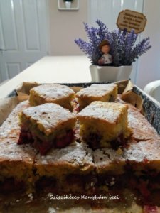 A hozzávalókat a meggy kivételével alaposan összekeverjük, sütőpapírral bélelt tepsibe öntjük (20×30 cm) , majd rászórjuk a meggyet. 180 fokon kb. 30 percig sütjük. Végezzünk tűpróbát!