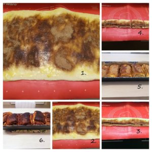 Lisztezett felületen 30×50 cm-es téglalappá nyújtjuk, megkenjük az előzőleg felolvasztott vajjal, megszórjuk a fahéjjal elkevert cukorral. Fontos: a vajból és a fahéjas cukorból is hagyjunk 1-1 kanálnyit a tetejére.