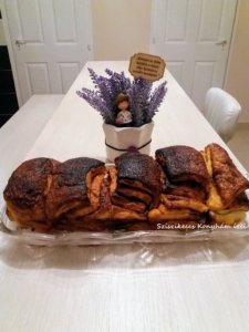 A kockákat sütőpapírral bélelt püspökkenyér formába sorakoztatjuk élével (most nézem, én nem is úgy tettem. Igazából így is szépre sült :D)Megkenjük a tetejét a maradék vajjal és fahéjas cukorral. Újabb 50 percig pihentetjük.